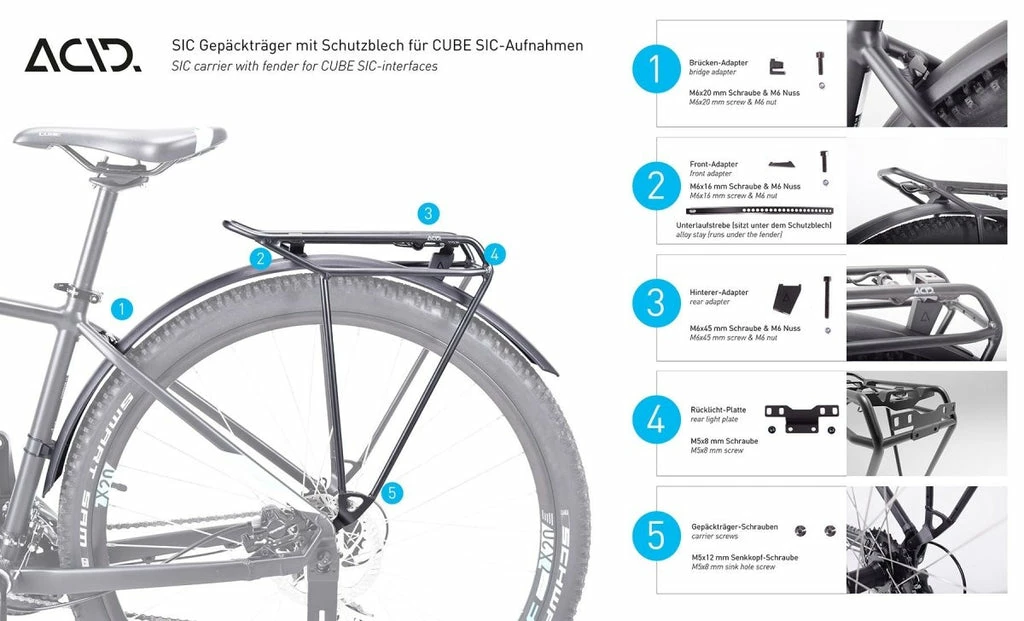 - Features kompatibel mit 29″ CUBE Mountainbikes ab Modelljahr 2019; kompatibel mit ACID Schutzblechen; RILink kompatibel; maximale Belastbarkeit 25 kg; Rücklichtaufnahme