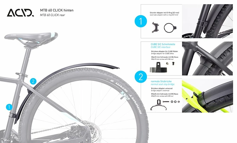 Click and go! Schutzblechmontage war noch nie so praktisch! Das ACID Mudguard Set MTB 60 Click ist mit den meisten 27,5″-29″ Mountainbikes und einer maximalen Reifenbreite von 2,25’’ kompatibel. Dank der speziellen Adapterlösung für CUBE Mountainbikes ab dem Modelljahr 2019 gelingt die Montage super schnell. Die verwindungssteife Profilgestaltung machen die Schutzbleche widerstandsfähig und langlebig.