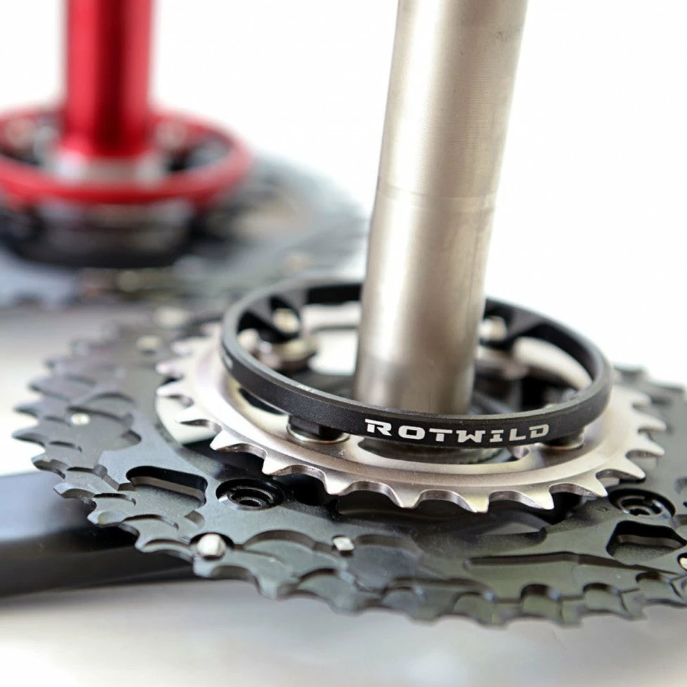 Der ACS-Ring wird direkt an der Kurbel unterhalb des kleinen Kettenblatts montiert und schützt den Rahmen vor Beschädigungen bei abspringender Kette.