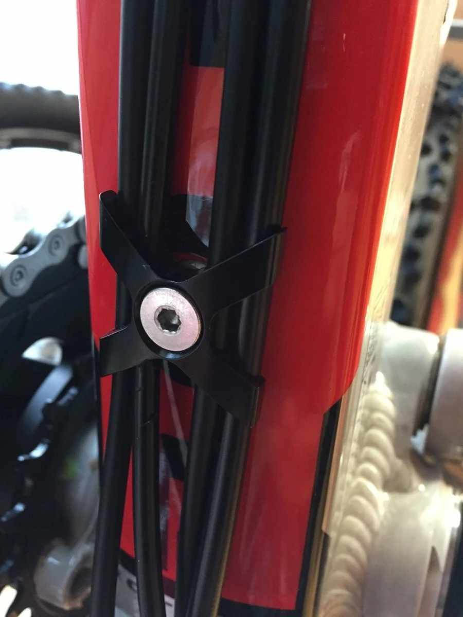 Gewichtsoptimierter Montageclip aus CNC gefrästem Aluminium. Unterrohr-Zugführung für bis zu vier Zughüllen/Leitungen.