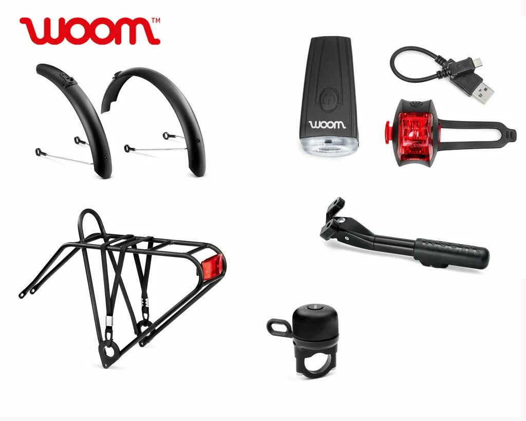 PICKUP Gepäckträger, LEGGIE Seitenständer, SNAP Steckschutzbleche, CYCLOPE Fahrradlichter, Woom Fahrradklingel in schwarz